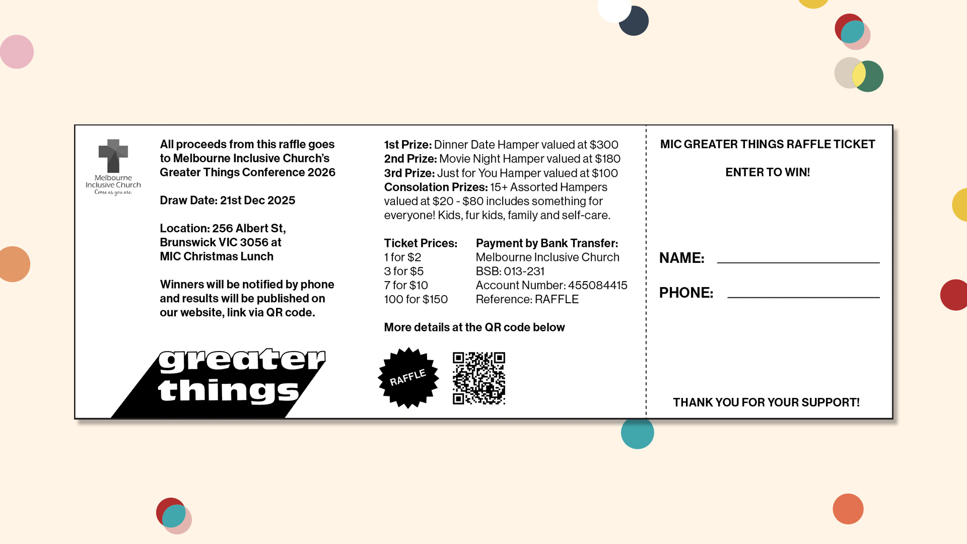 All proceeds from this raffle goes to Melbourne Inclusive Church’s Greater Things Conference 2026